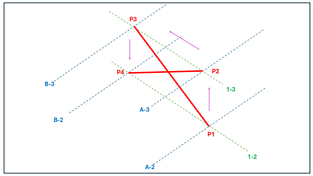 As the brace is on grid 1 and between grid A and B, the start point of brace P1 lies at the intersection of grids 1 & A at level 2. The second point of the brace P2 lies at the intersection of grid lines 1 and A at level 3. The third point P3 lies at the intersection of gridlines B & 1 at level 3 while P4 lies at the intersection of the same gridlines but at level 2.