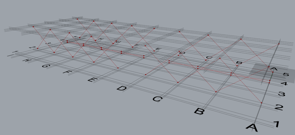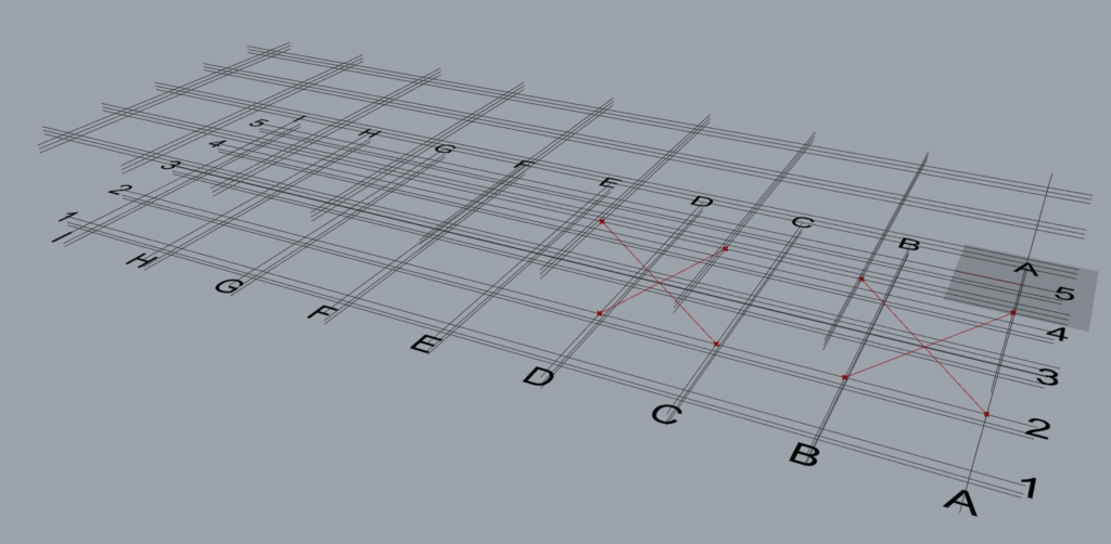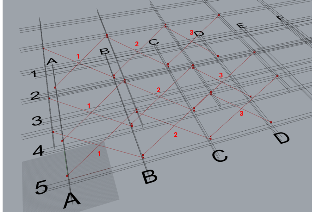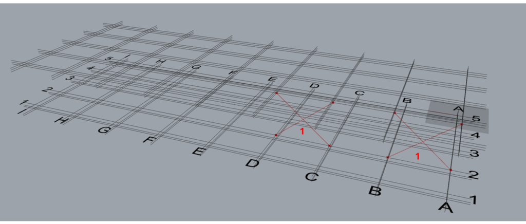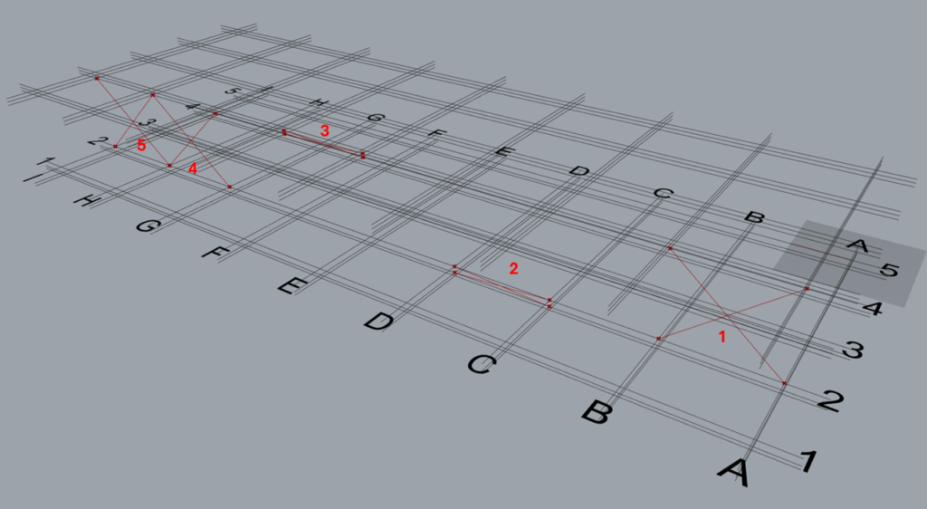 | Group 1 | Along | 2,4,5 | This input creates 3 sets of braces on grid 2,4 and 5 in between grids A & B from levels 2 to 3. Set 1: Between grids A & B, on grid 2. Set 2: Between grids A & B, on grid 4. Set 3: Between grids A & B, on grid 5. |