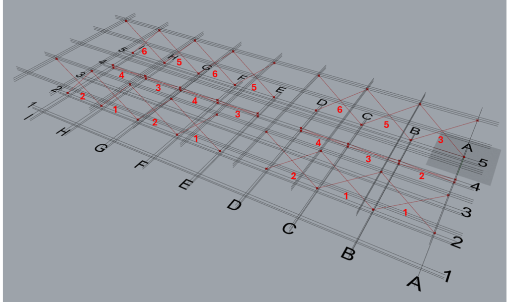 | Along | 2 | This arrangement creates 3 sets of braces on grid 2 between levels 2 and 3. Set 1: Between grids A & B. Set 2: Between grids B & C. Set 3: Between grids C & D. |