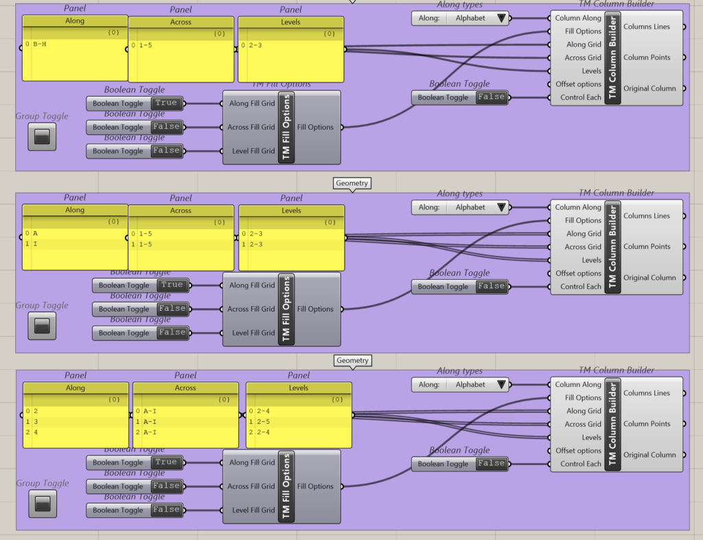 - Component 1: This definition creates column lines along grid B to H across grids 1 & 5 between levels 2 and 3. In total it models 14 column lines.