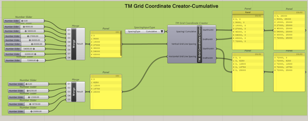 The ‘TM Grid Builder’ is a supplementary component for the ‘TM Grid Builder’. It helps by creating coordinates of the start and end points of the gridlines based on spacings given by the user. These coordinates can then be used directly with ‘TM Grid Builder’.