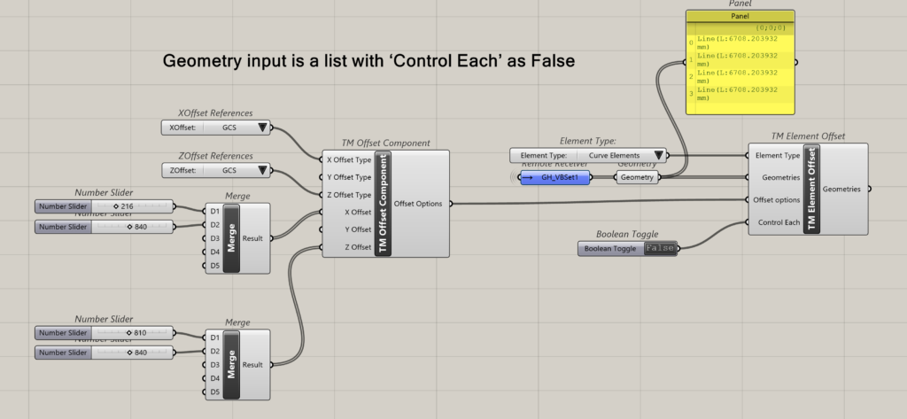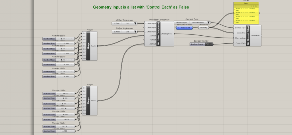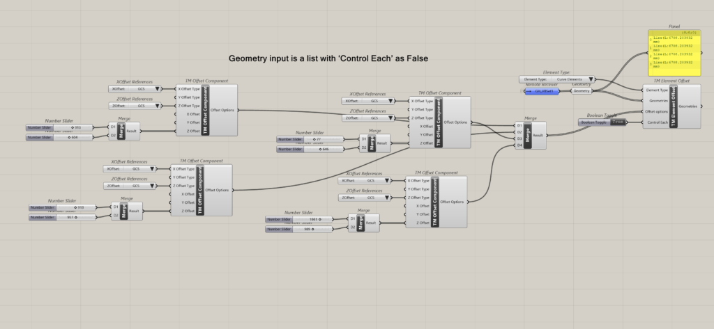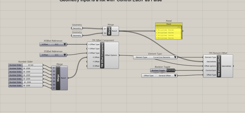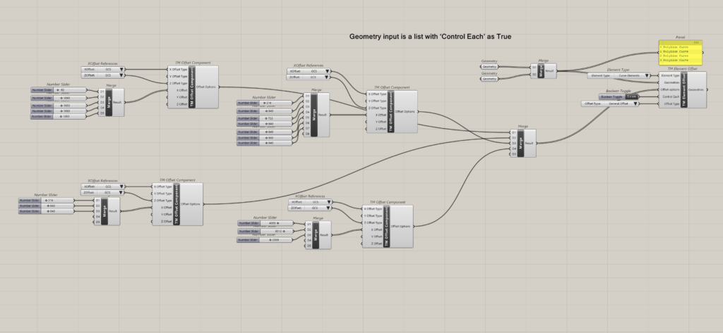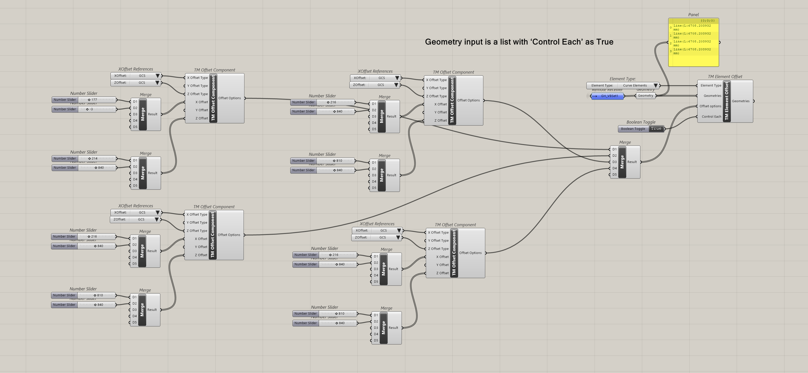 Only one ‘TM offset’ component need be attached. It controls all the geometry inputs together. Ideal for situations where all the geometries in the list are subjected to offsets of same distances.